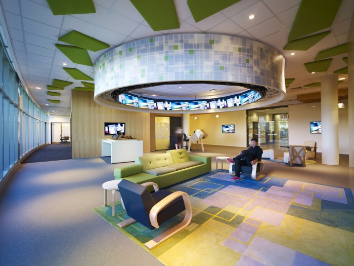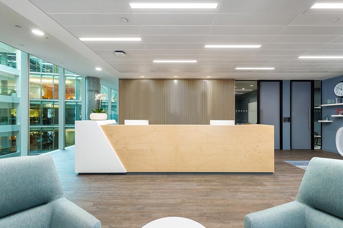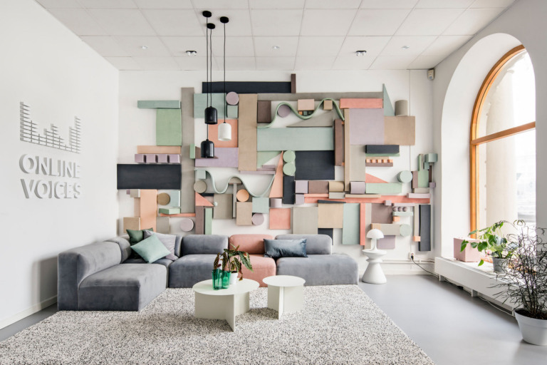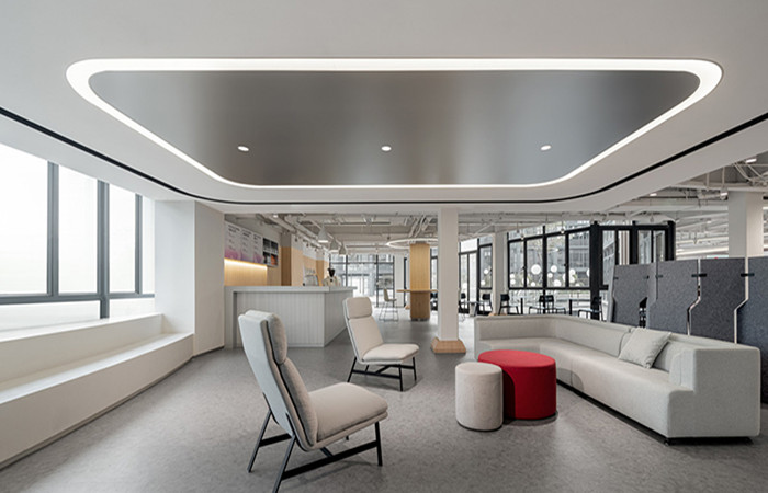 4300平米醫(yī)療公司辦公空間設(shè)計(jì)布局,平靜的色彩、柔軟的面料和以類似色調(diào)選擇的彎曲形式提供了所需的寬敞和平靜的氛圍。彎曲的墻壁從入口連續(xù)延伸,增強(qiáng)了空間的連續(xù)性,并通過在墻壁內(nèi)創(chuàng)建的彩色壁龕創(chuàng)建了咖啡店區(qū)域等功能區(qū)域。